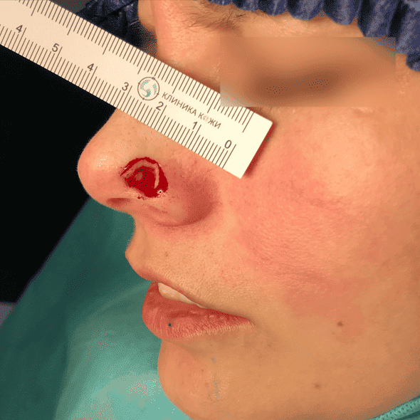 Операция по Mohs. Сделан отступ в 1 мм от дерматоскопически определяемых границ, резецированный лоскут отправлен на гистологию. В зоне седьмого часа на условном циферблате потребовалась дополнительная клиновидная эксцизия еще одного миллиметра от первоначального дефекта. Проведено простое линейное ушивание параллельно носогубной складке.